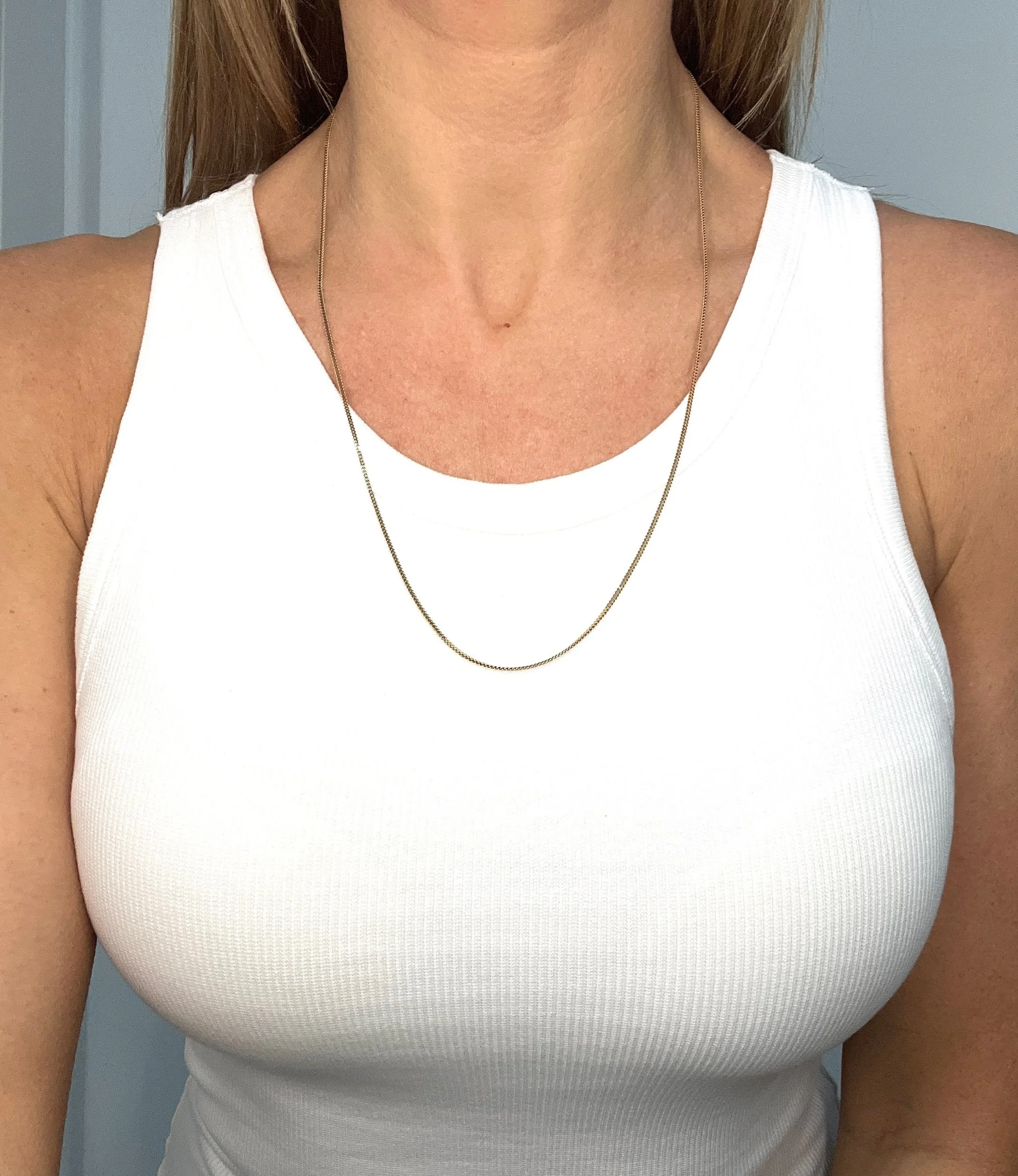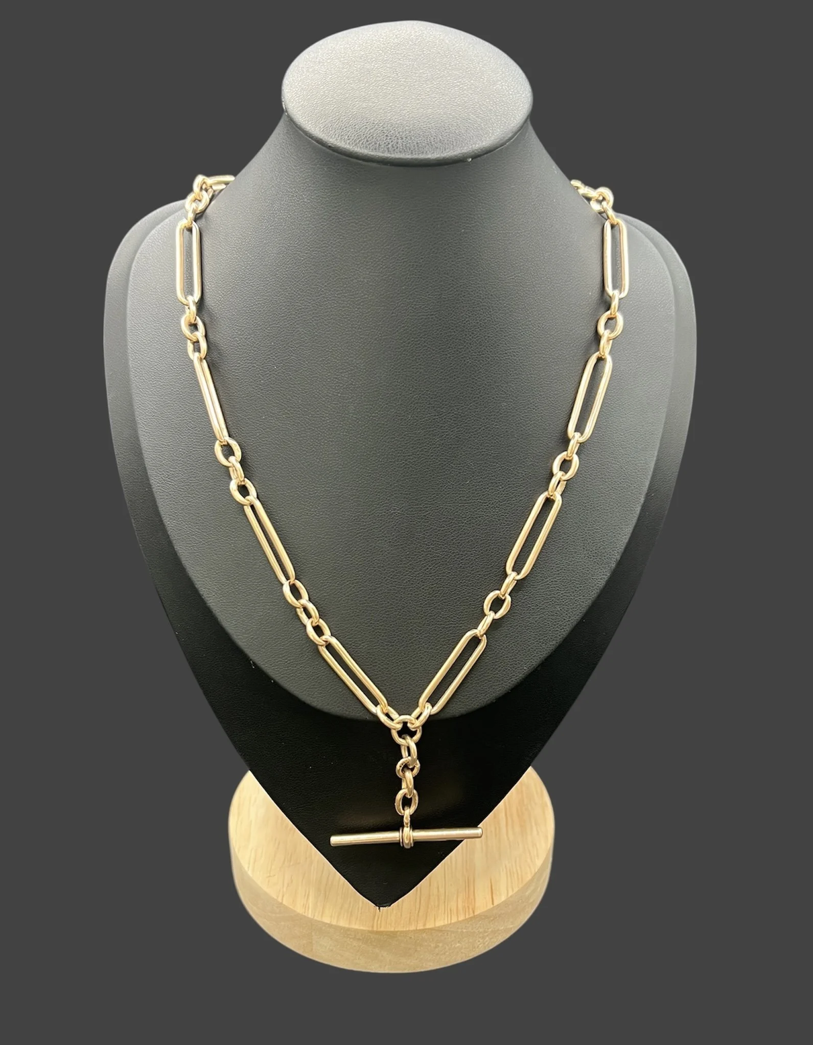 Designed for both style and functionality, the chain is fastened with reliable swivel clasps, ensuring secure wear. Adding to its charm, a 39.3mm T-bar is suspended from a 28mm length of chain.