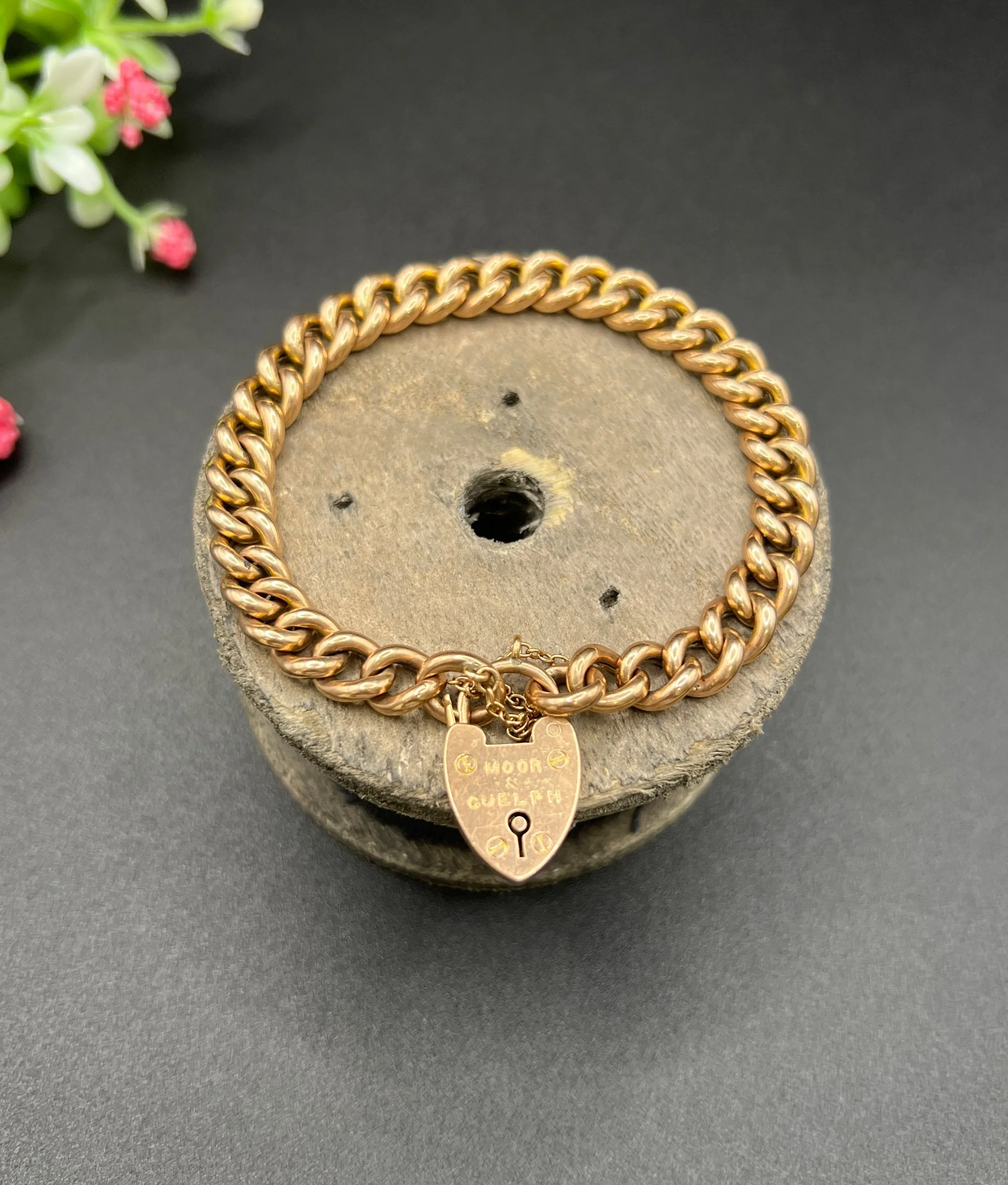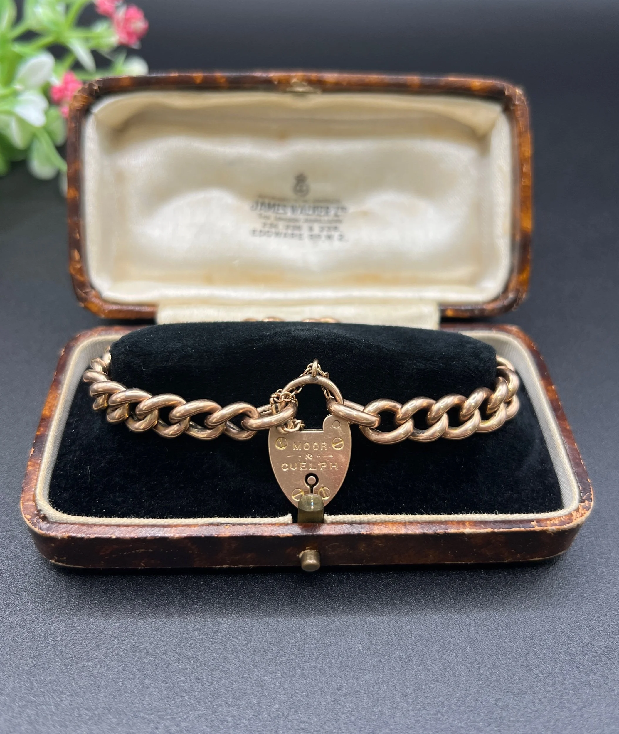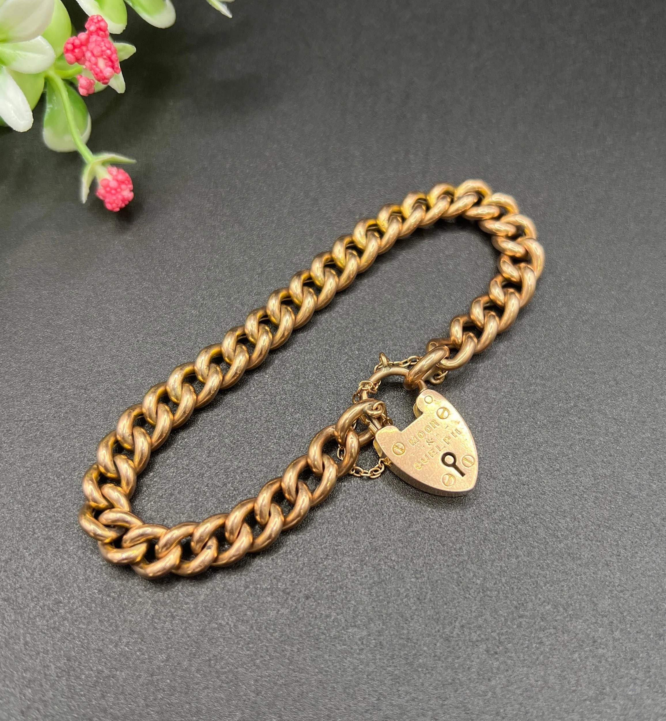 Introducing a stunning piece of Victorian elegance: a 9ct rose gold curb link bracelet that exudes charm and history. This exquisite bracelet features a beautifully detailed heart padlock clasp, complete with a delicate safety chain for added security. The front of the clasp is elegantly engraved with "Moor & Guelph," showcasing the craftsmanship of the period.