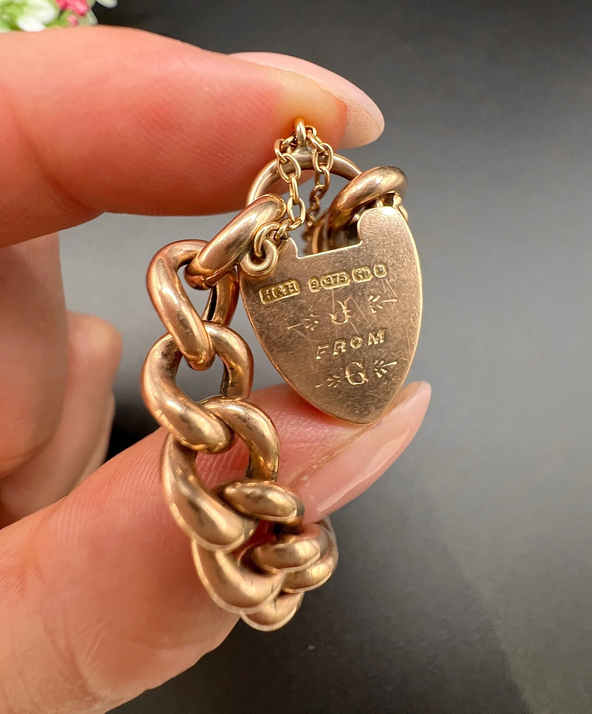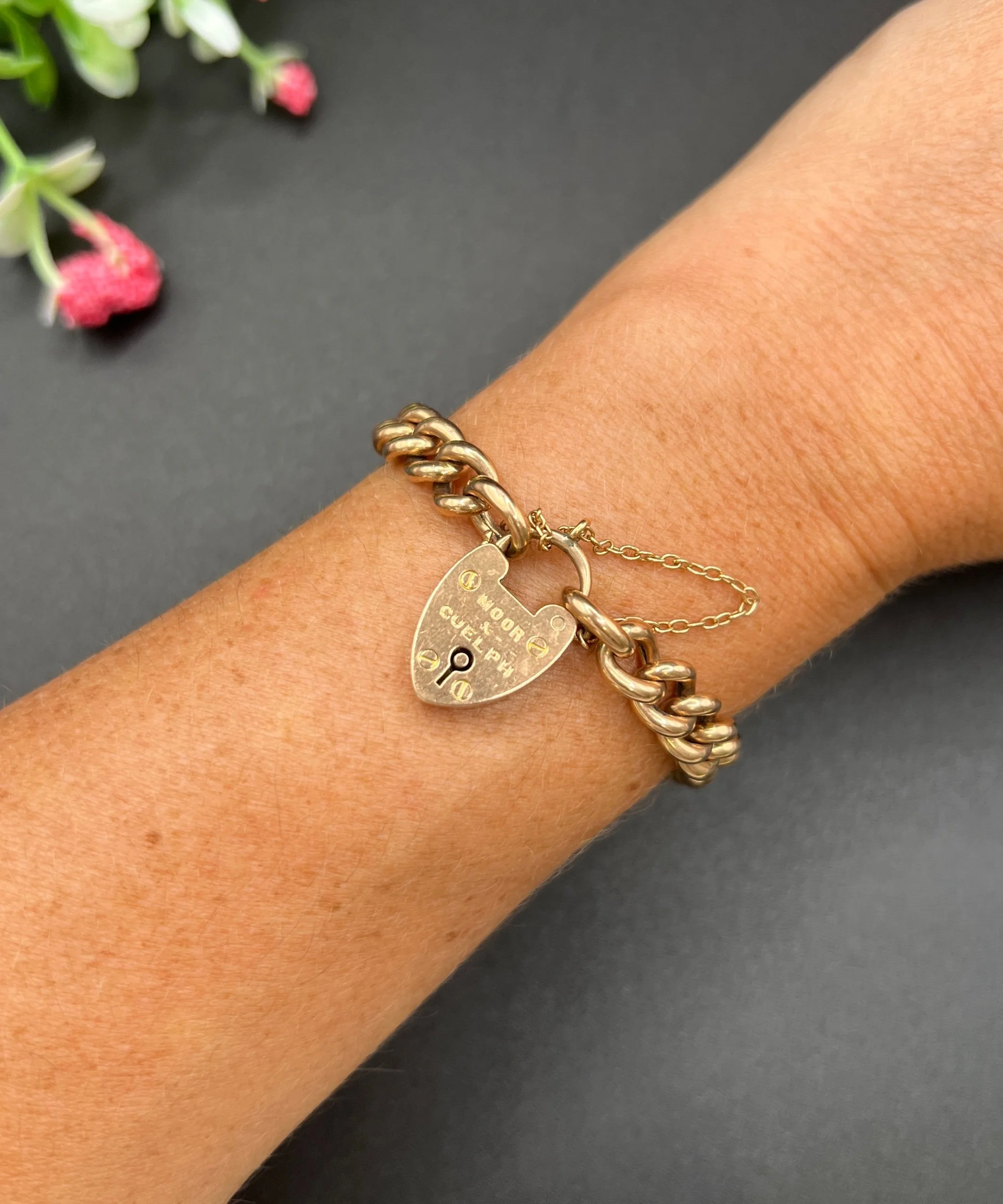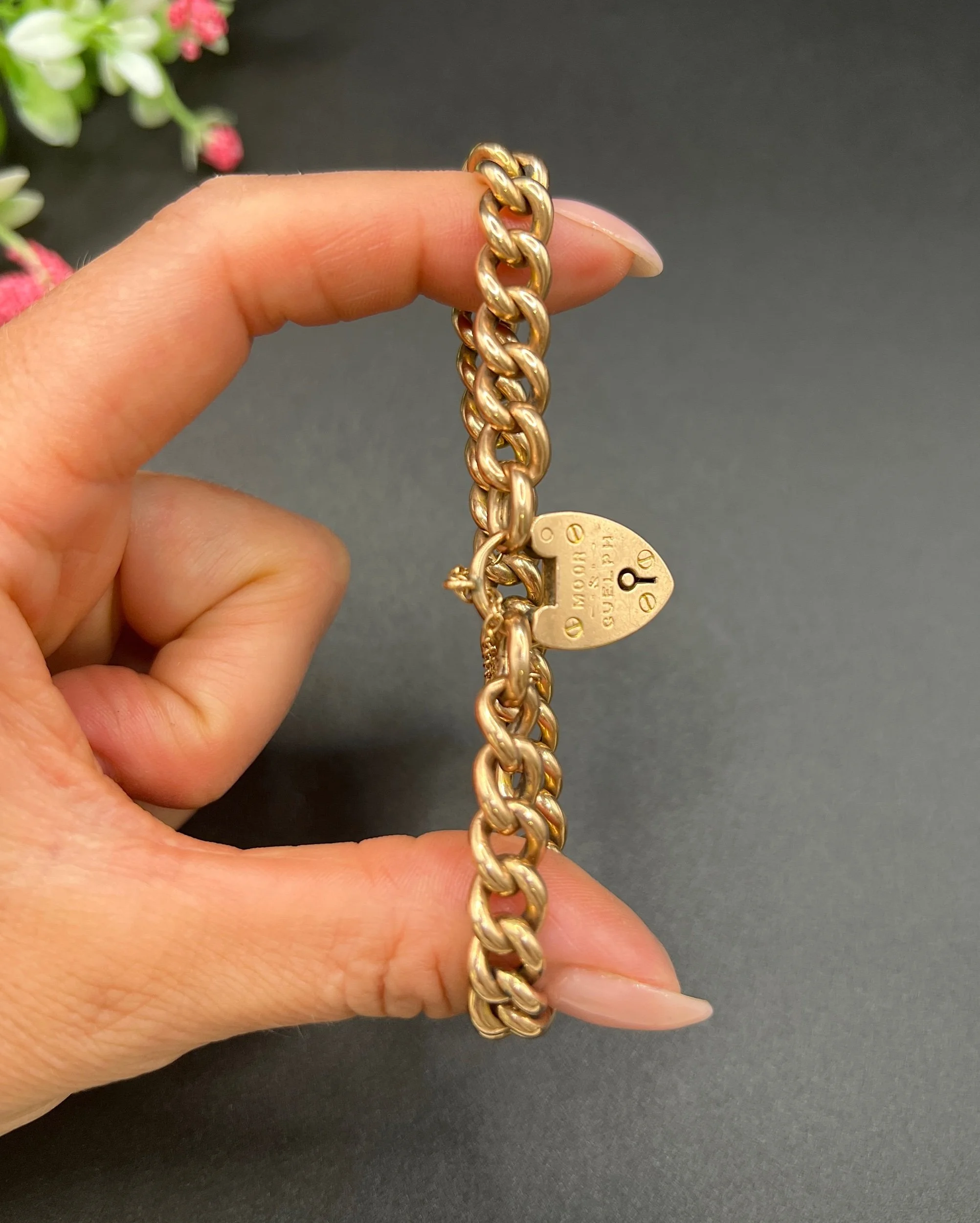 Introducing a stunning piece of Victorian elegance: a 9ct rose gold curb link bracelet that exudes charm and history. This exquisite bracelet features a beautifully detailed heart padlock clasp, complete with a delicate safety chain for added security. The front of the clasp is elegantly engraved with "Moor & Guelph," showcasing the craftsmanship of the period.