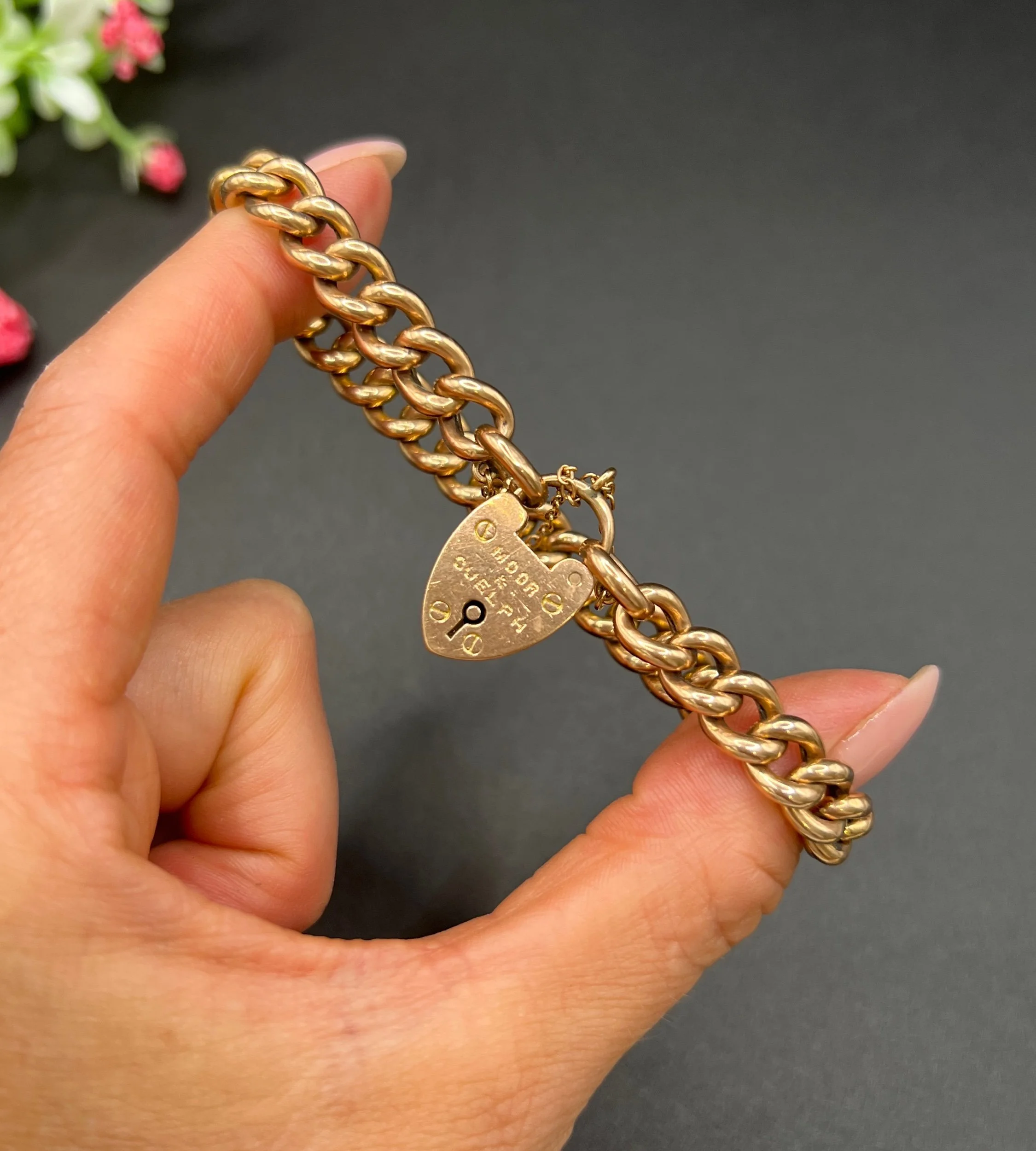 Antique 9ct Rose Gold Stamped, Victorian 7 3/4 Inch Curb Link Bracelet with Heart Padlock Clasp, Hallmarked Birmingham 1876
