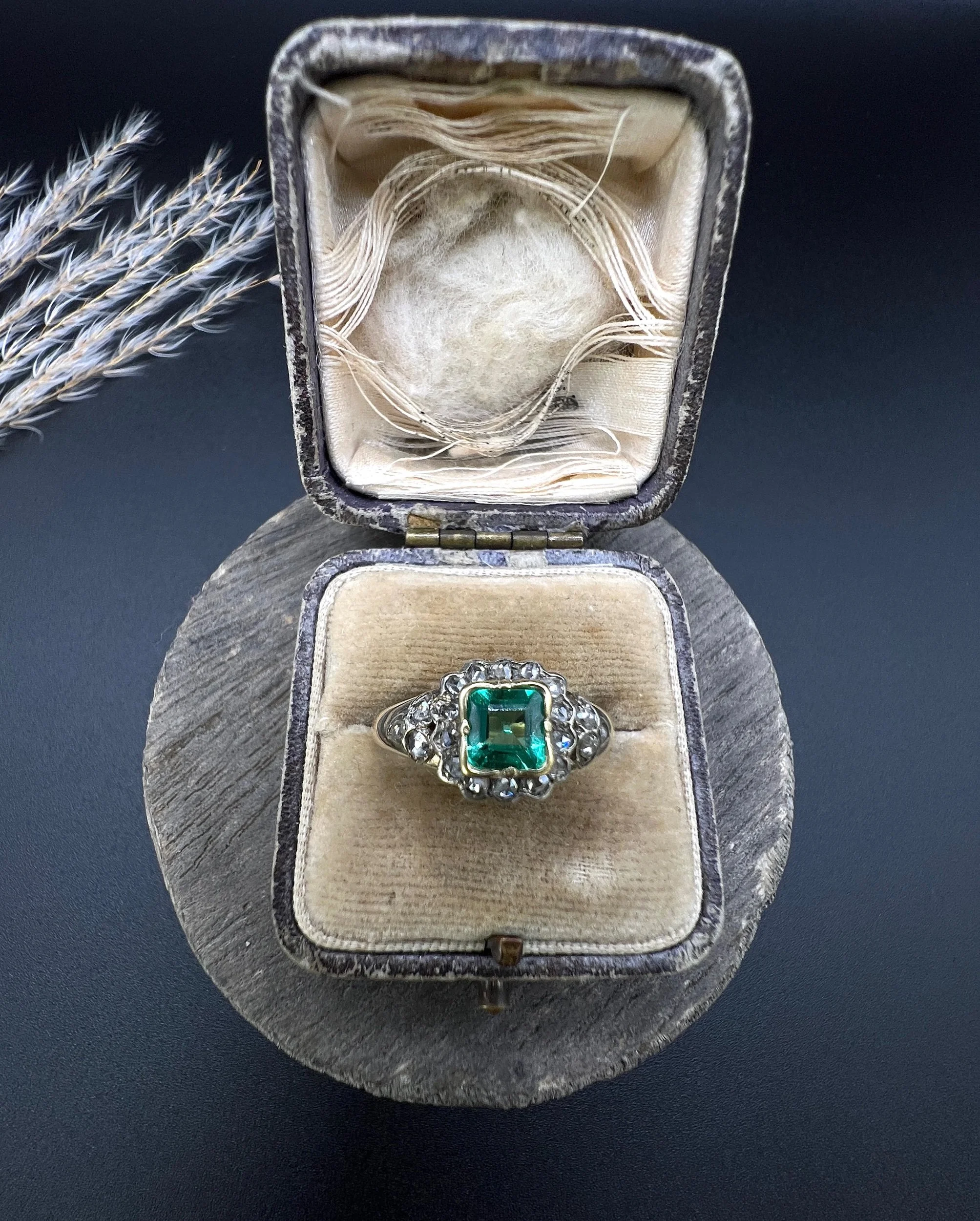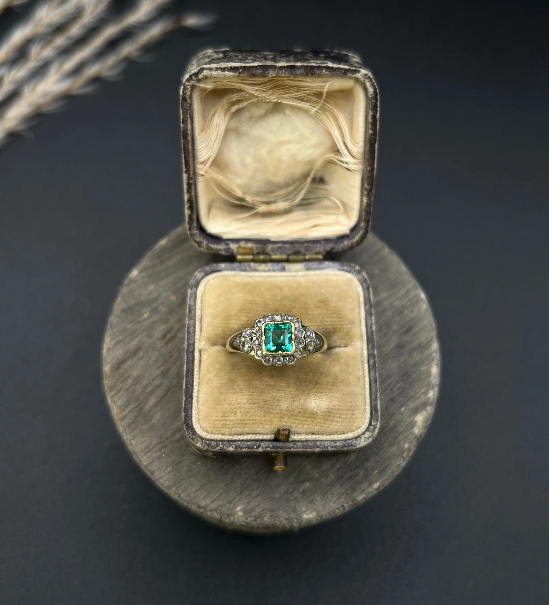 Step back in time to the elegance of the Early Victorian era with this exquisite 18ct gold square cluster ring. At its centre sits a breathtaking square-cut natural emerald, radiating a rich green hue that captures the eye. This stunning stone is beautifully framed by a halo of sparkling natural diamonds, each set in lustrous silver that enhances their brilliance and provides a striking contrast to the vibrant emerald.