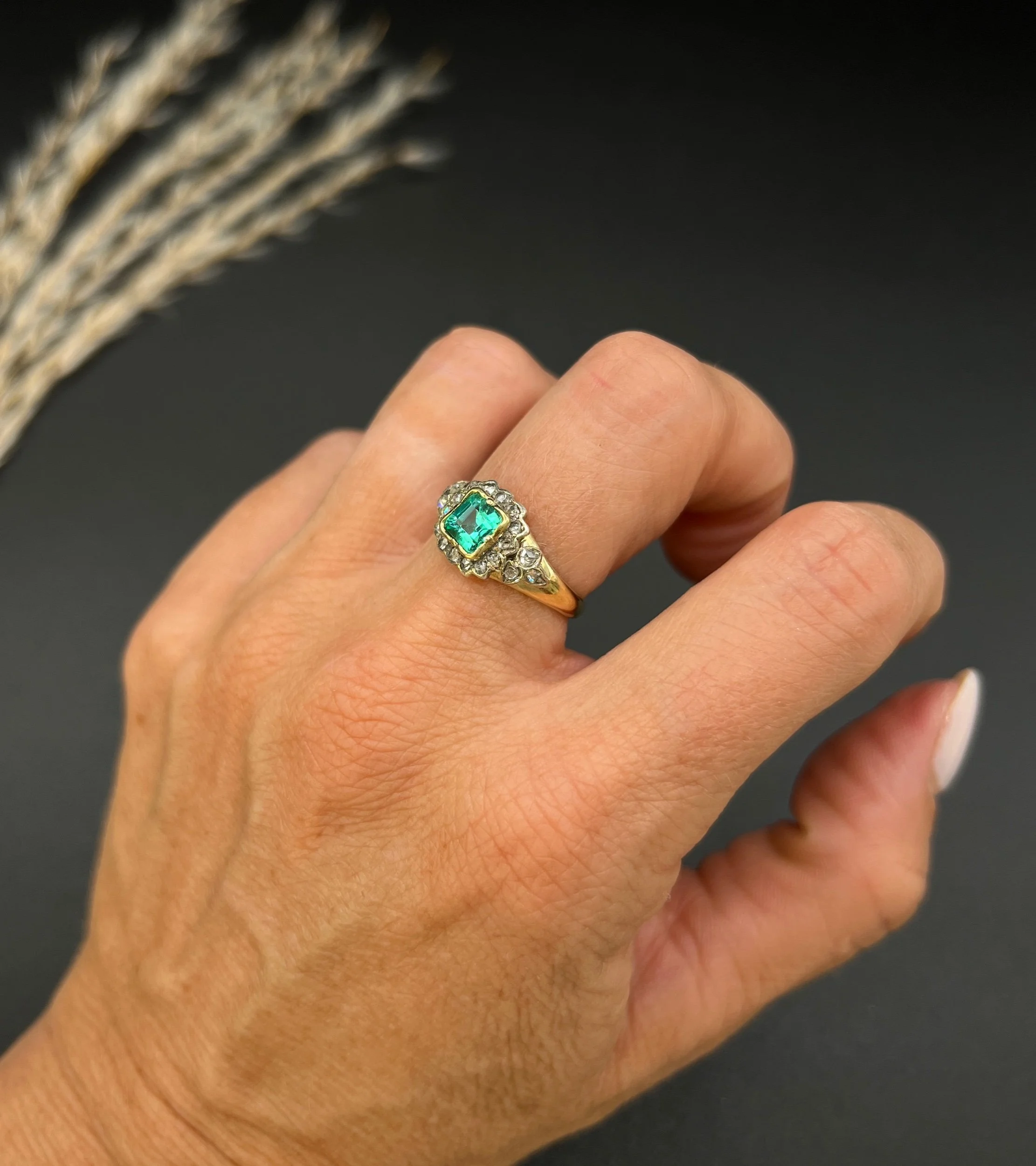 Antique 18ct Yellow Gold, Early Victorian Emerald and Diamond Square Cluster Ring