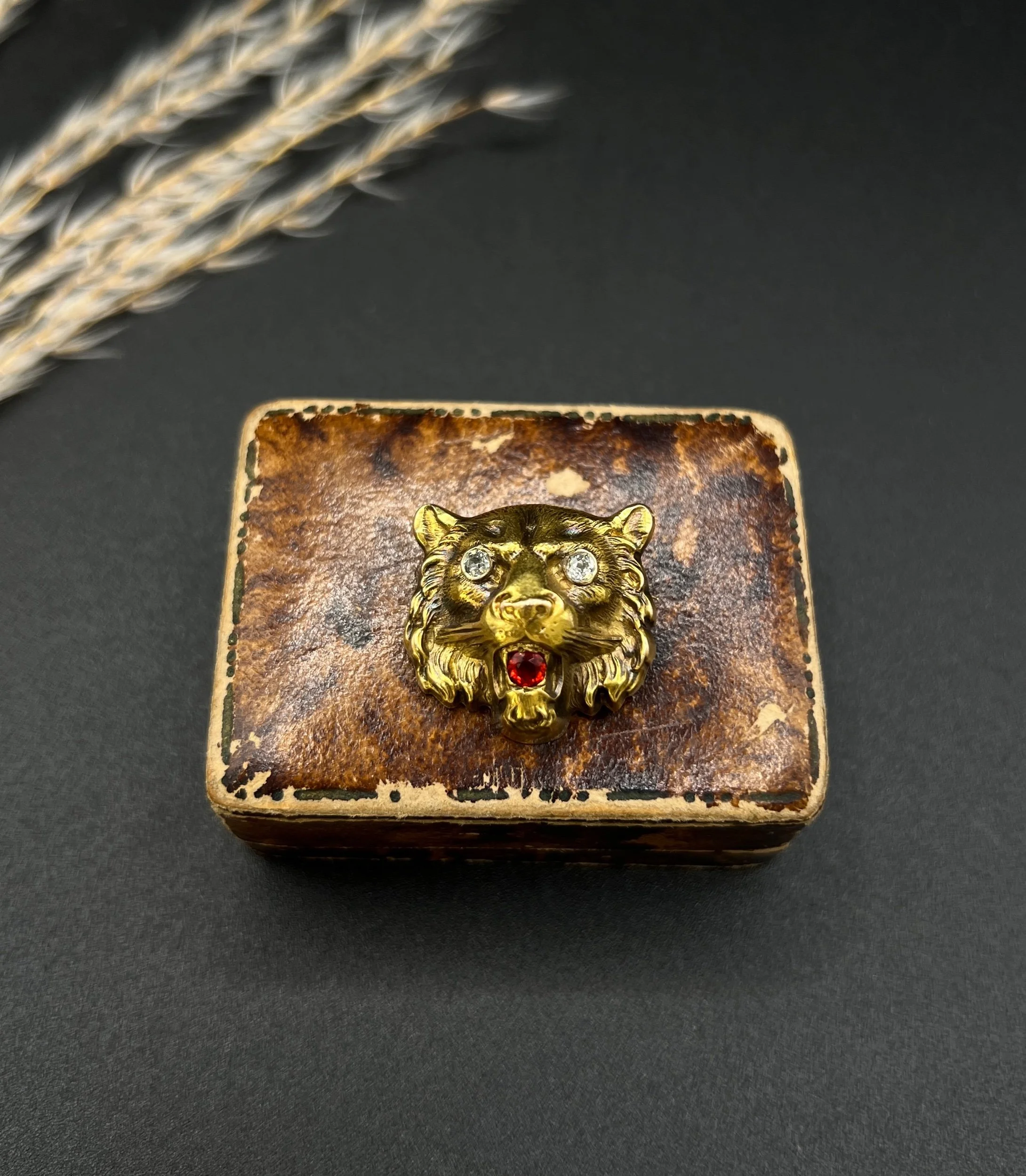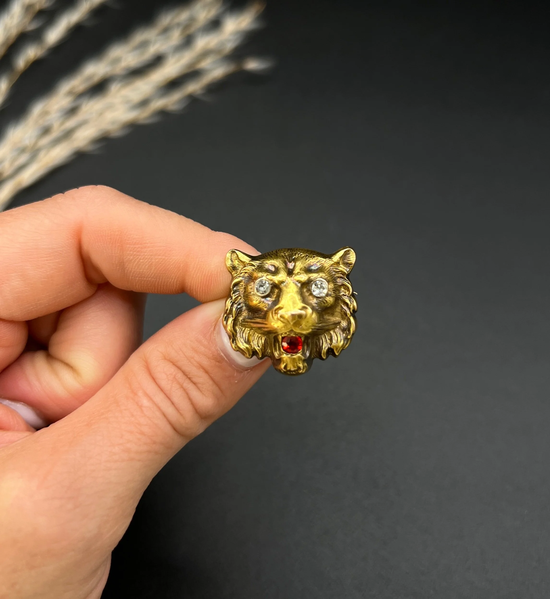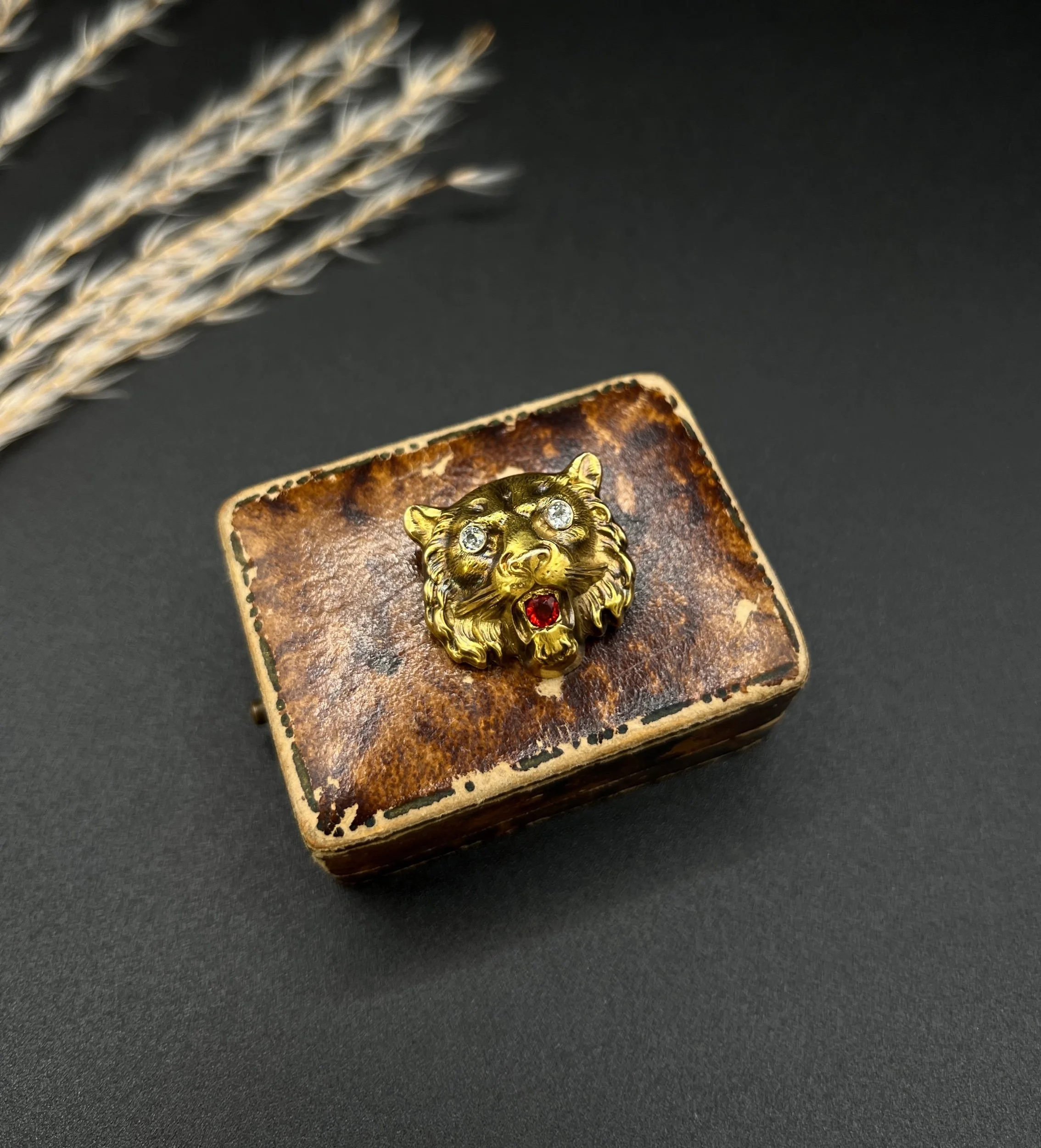 Elevate your jewellery collection with this exquisite 1920s tiger's head brooch, crafted from 18ct gold. This striking piece features a hollow design that enhances its lightweight charm while allowing intricate detailing to shine through.