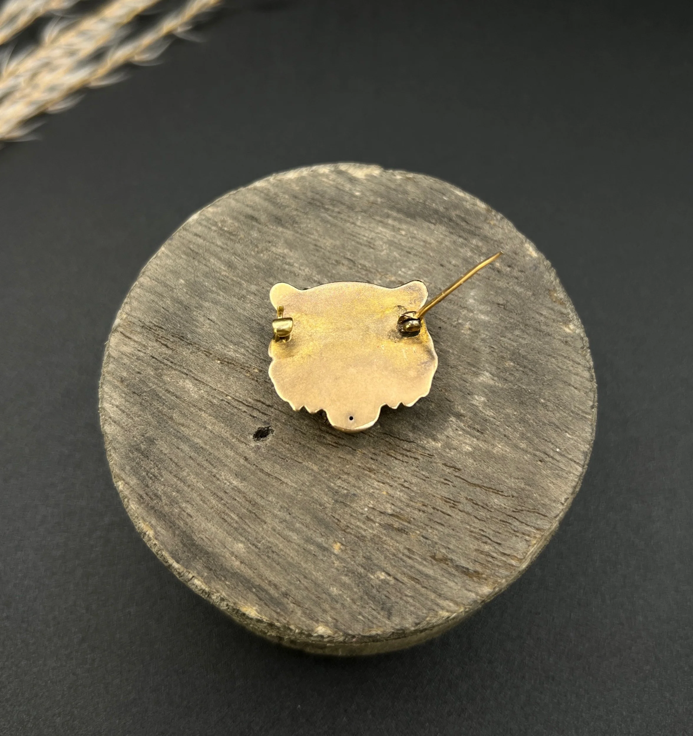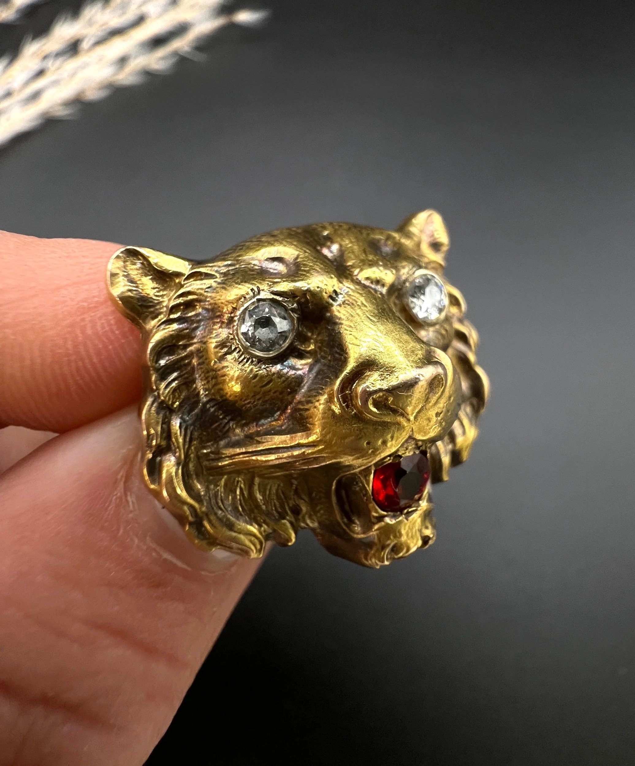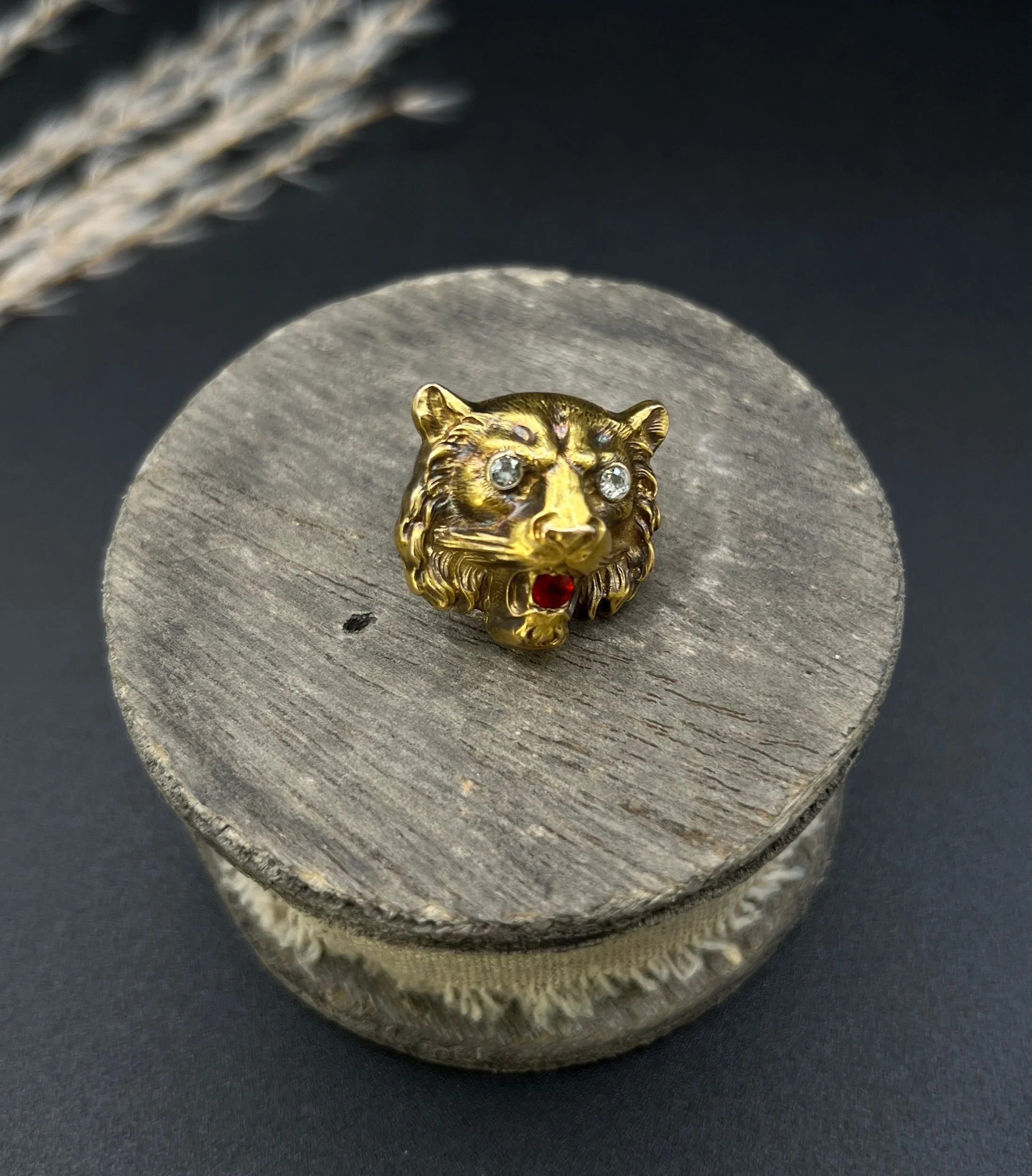 Elevate your jewellery collection with this exquisite 1920s tiger's head brooch, crafted from 18ct gold. This striking piece features a hollow design that enhances its lightweight charm while allowing intricate detailing to shine through.